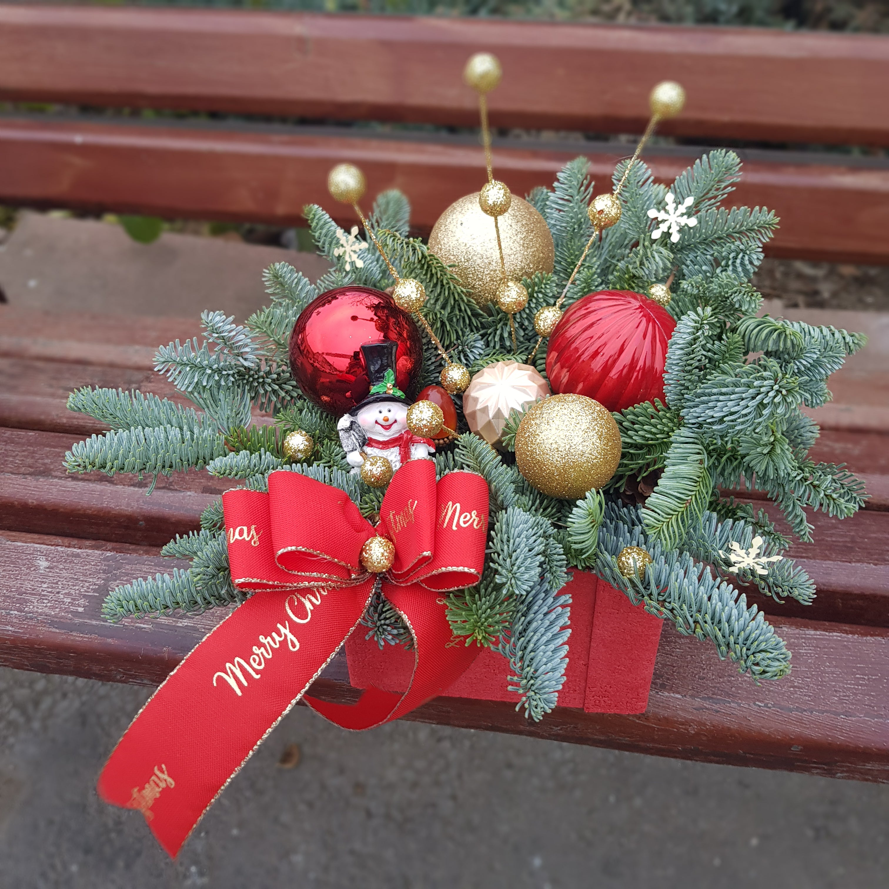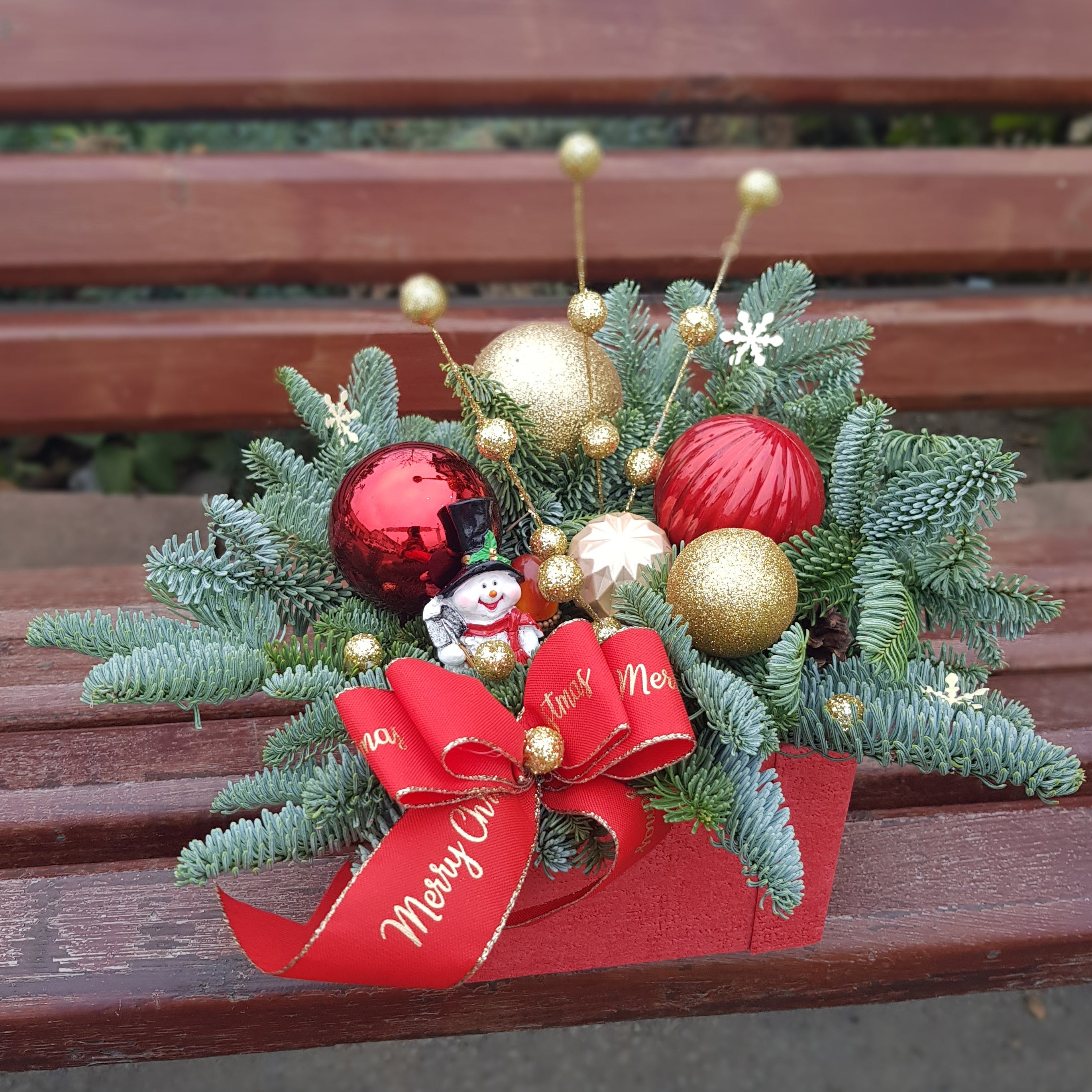 „Christmas Joy” este un aranjament de Crăciun realizat din brad natural proaspăt, decorat cu globuri decorative în nuanțe de roșu și auriu, accente festive specifice sărbătorilor de iarnă. Panglica decorativă roșie cu mesaj de Crăciun completează armonios compoziția, oferind un aspect cald, tradițional și primitor.