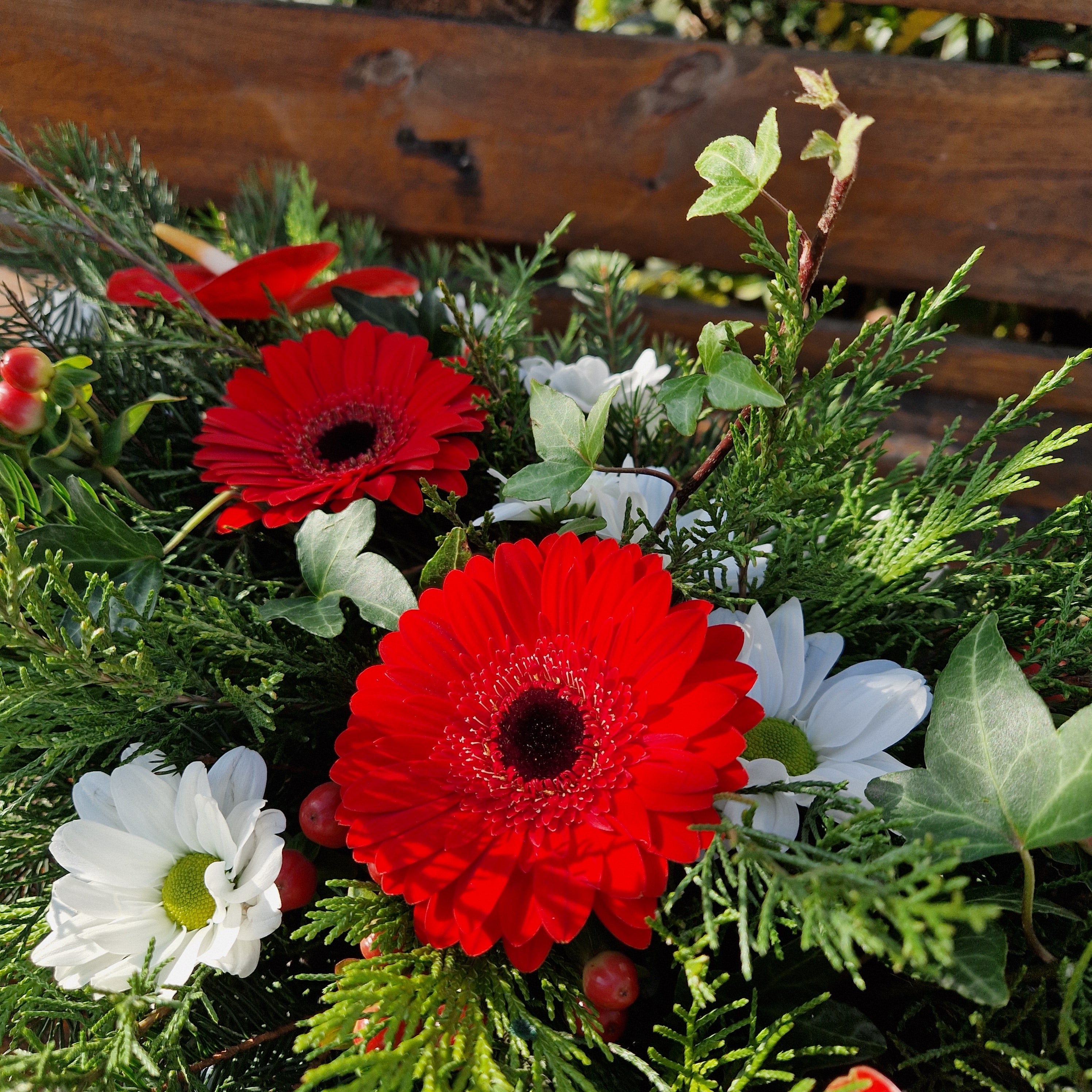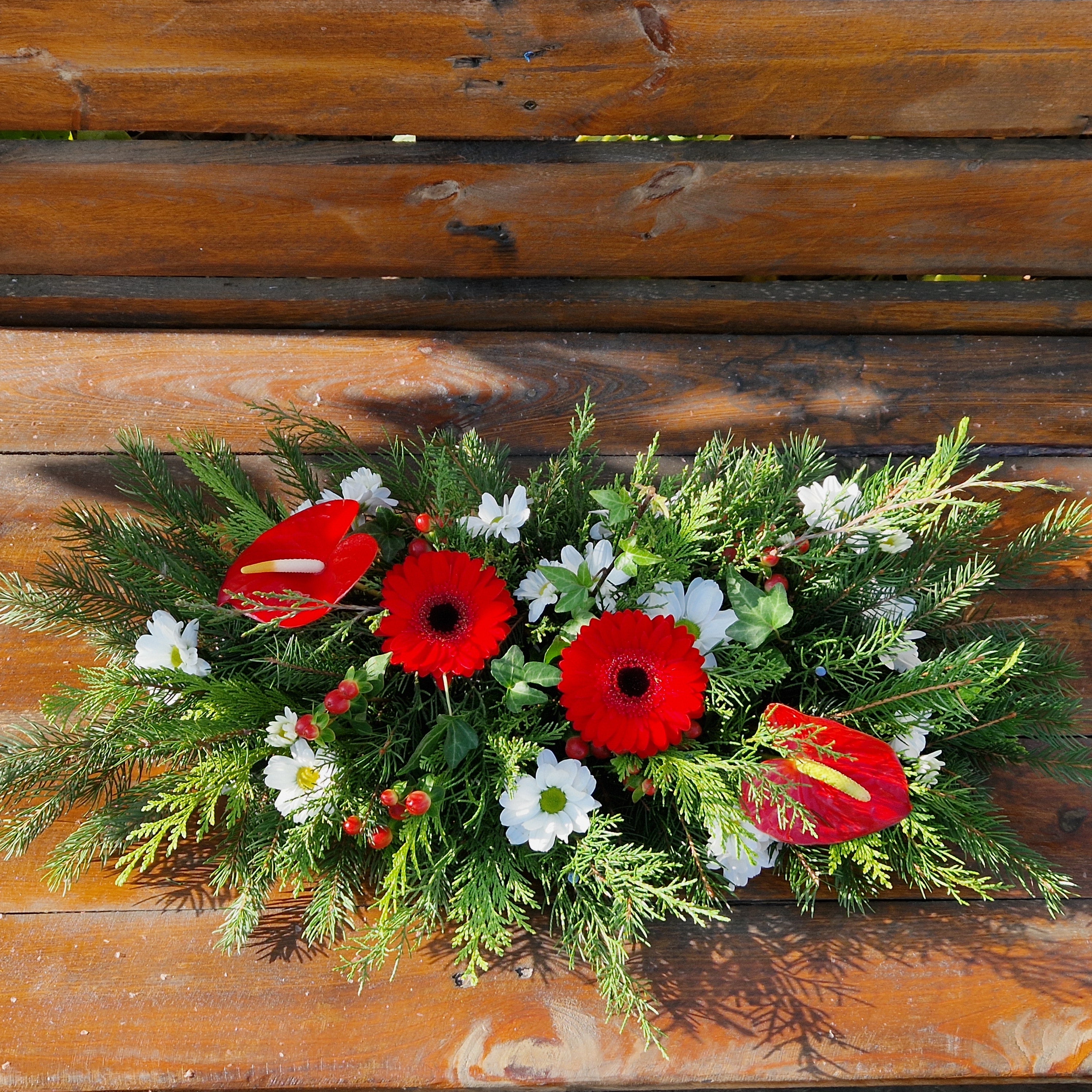 Un aranjament floral elegant, realizat pe burete floral pentru prospețime de lungă durată. Designul îmbină armonios 2 anturium rosu, 2 germini rosu, 2 crizanteme albe și hypericum, completate de o bază bogată din brad, iederă și tuia. Texturile contrastante și culorile vibrante creează o compoziție rafinată, potrivită pentru evenimente funerare, comemorări sau pentru a transmite un mesaj de respect și susținere.