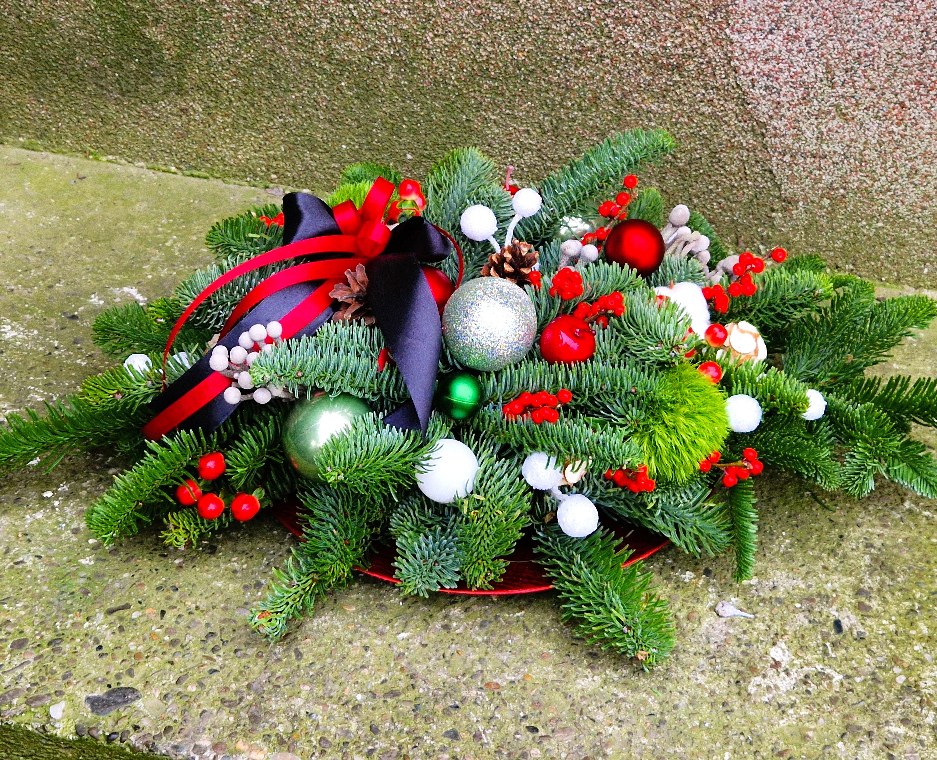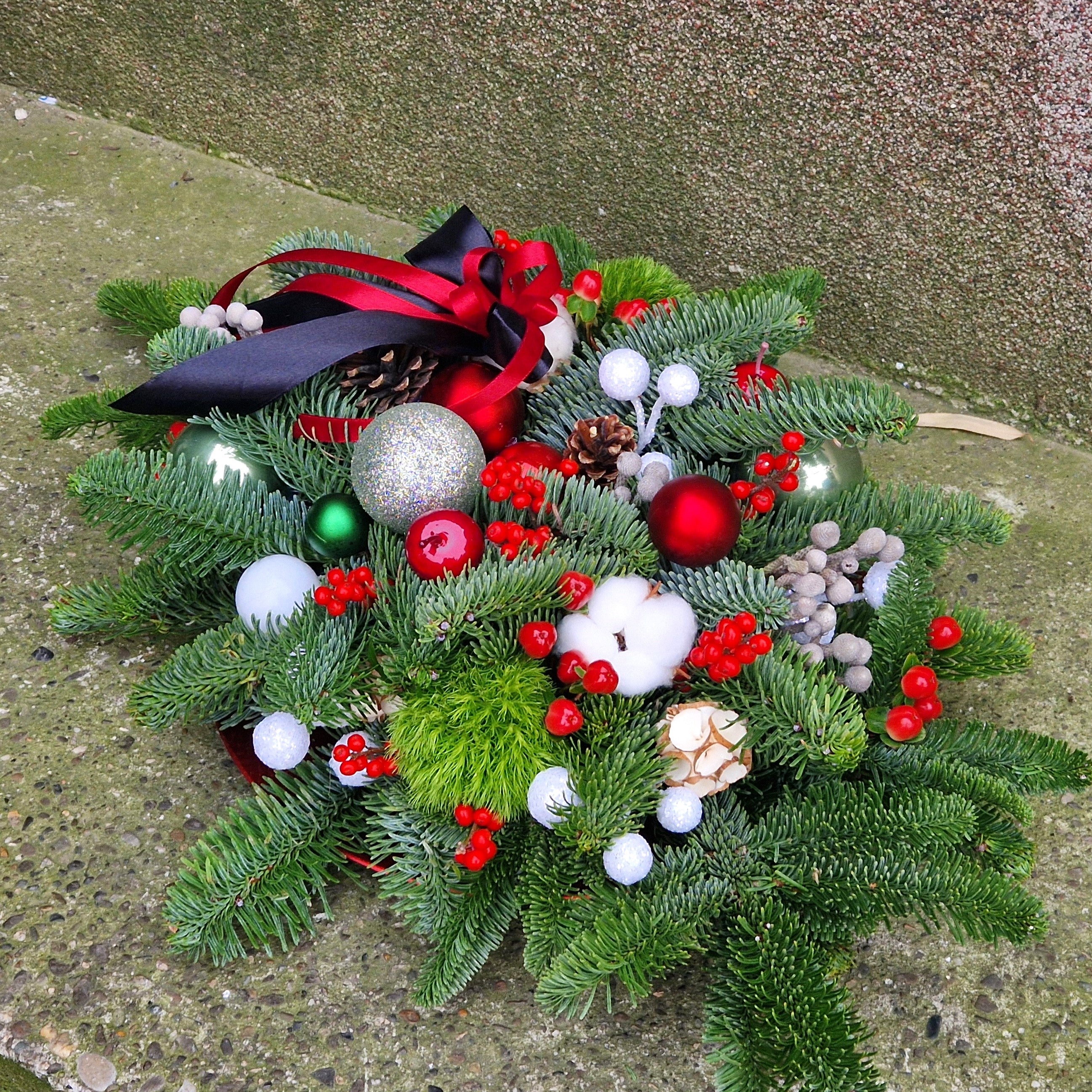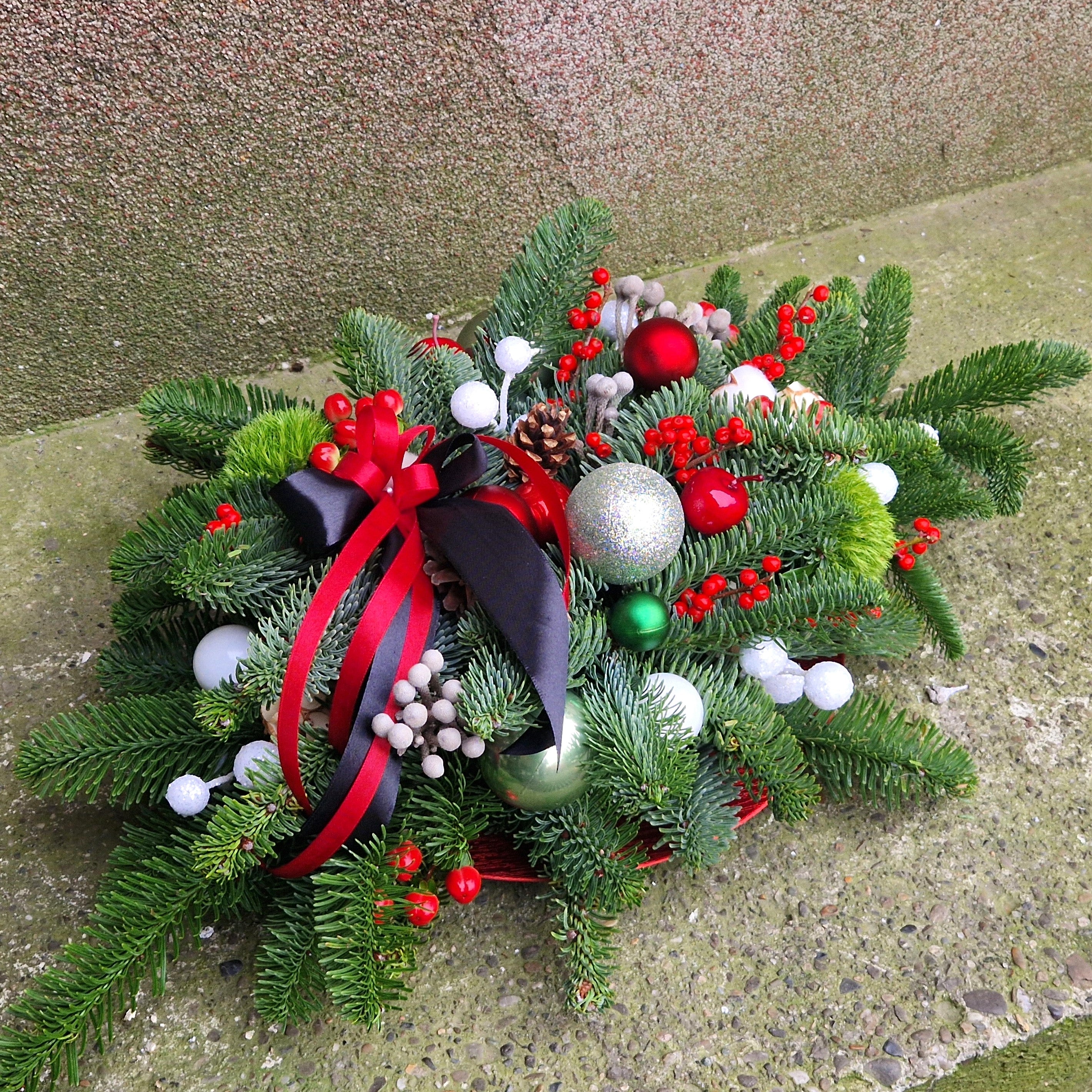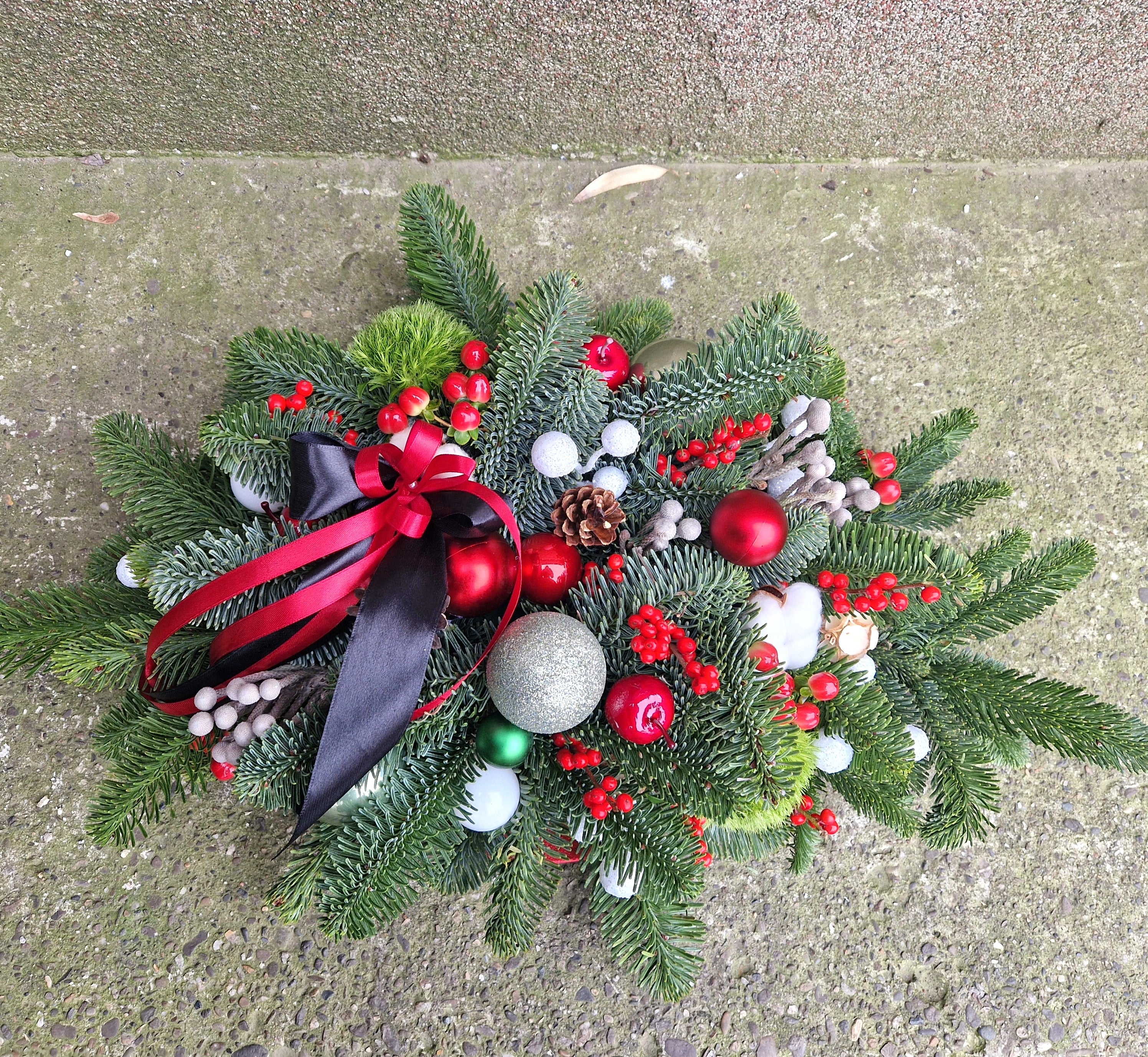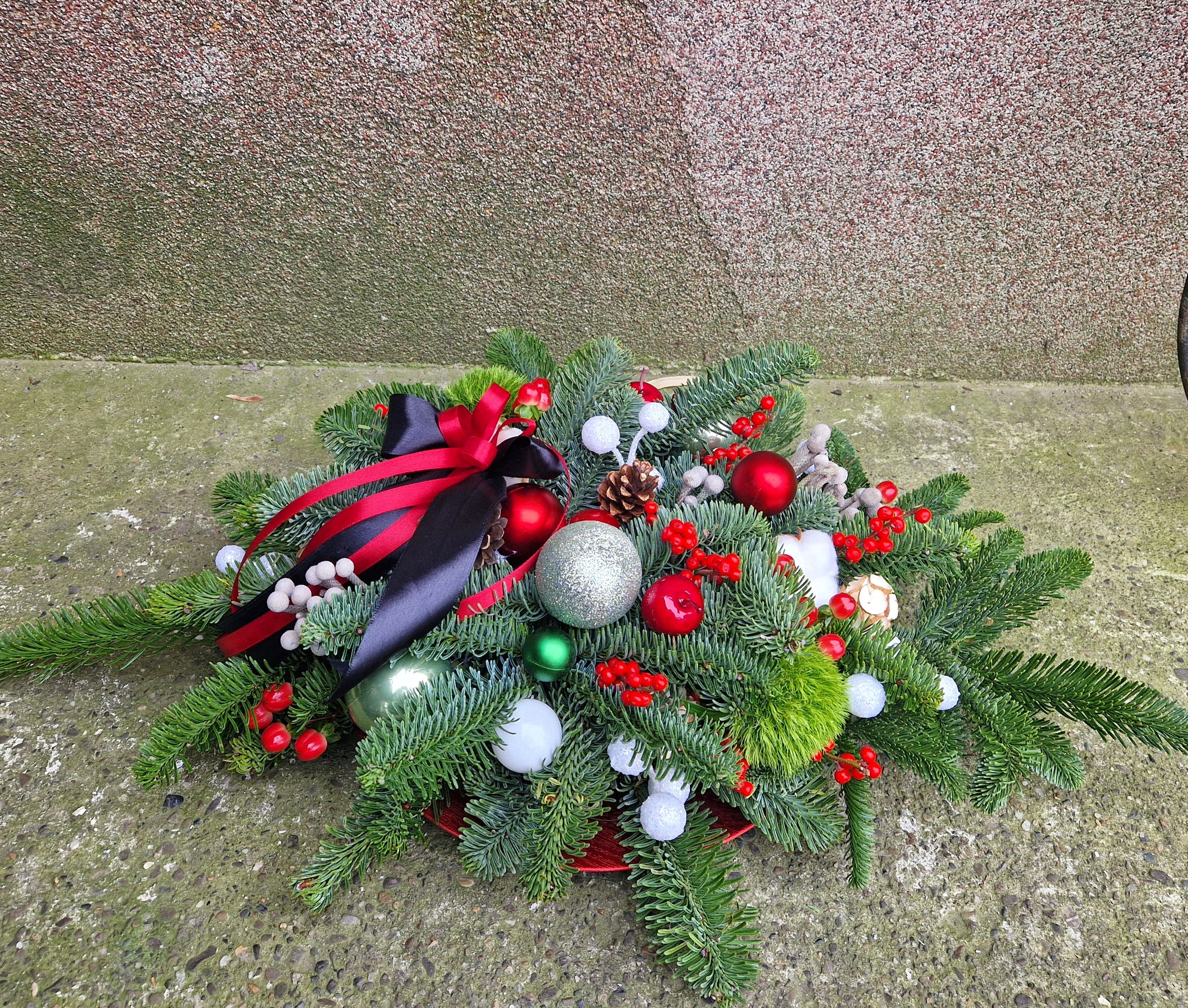 Aranjament floral de iarnă pentru comemorare adaptat pentru a fi așezat pe mormânt, realizat din brad nobilis proaspăt, cunoscut pentru rezistența sa îndelungată și completat cu ramuri de ilex roșu, hypericum, garoafe pufoase, brunia si bumbac. Aranjamentul îmbină eleganța sezonului cu simbolistica profundă a aducerii aminte.