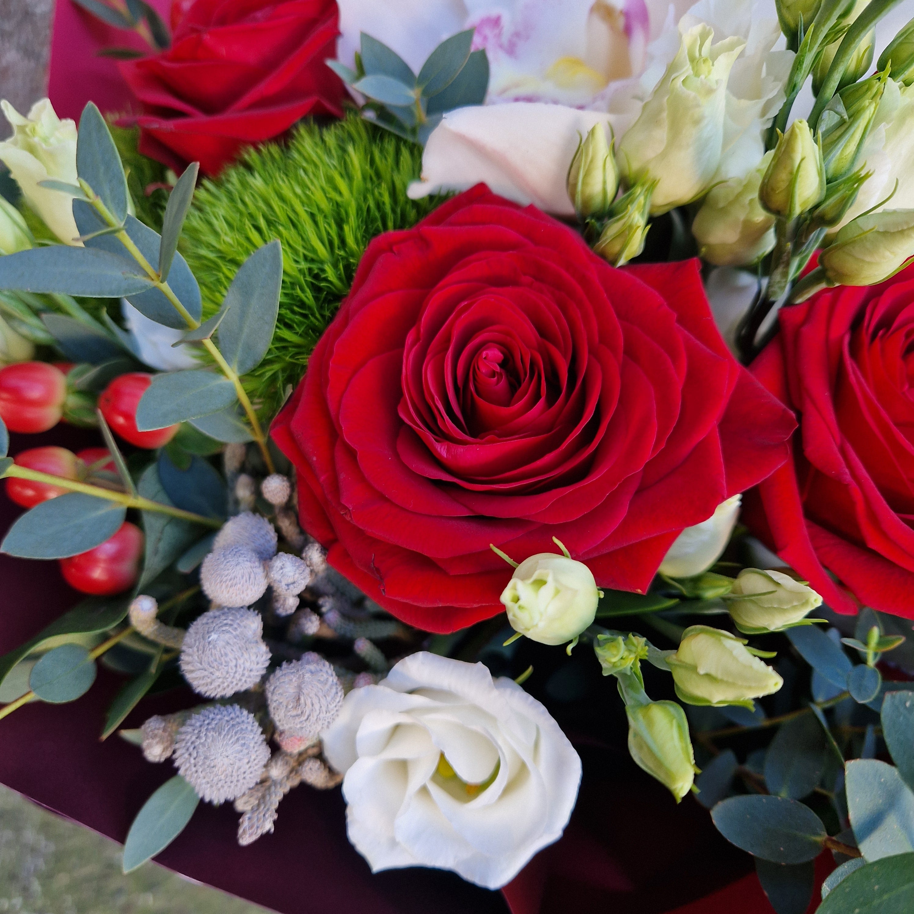 Acest buchet elegant combină rafinamentul celor 2 flori de cymbidium alb cu 5 trandafiri roșii, completat de delicatețea a 2 fire de eustoma albă. Texturile speciale ale bruniei, prospețimea green trick și notele calde ale celor 3 fire de hypericum aduc volum și un plus de naturalețe.