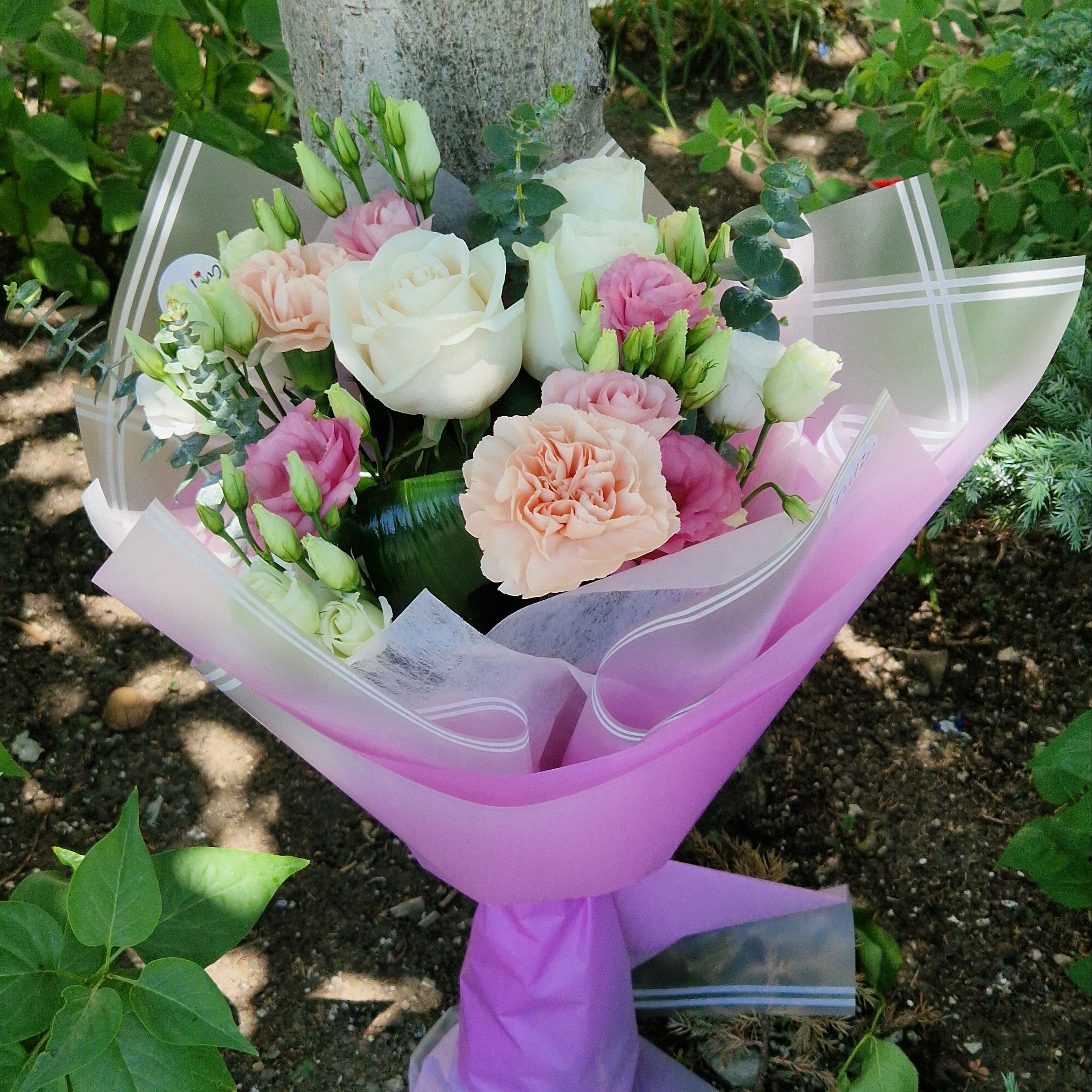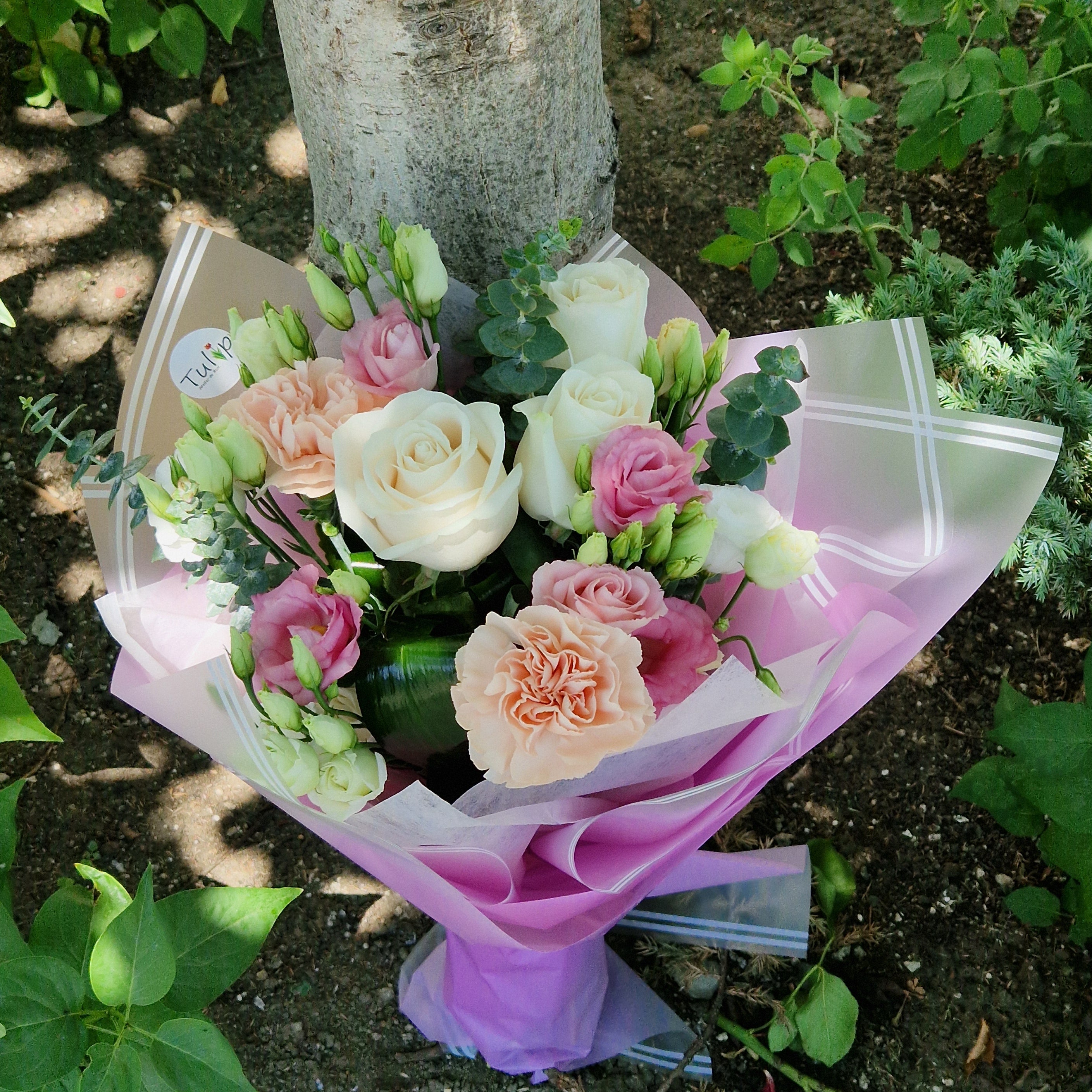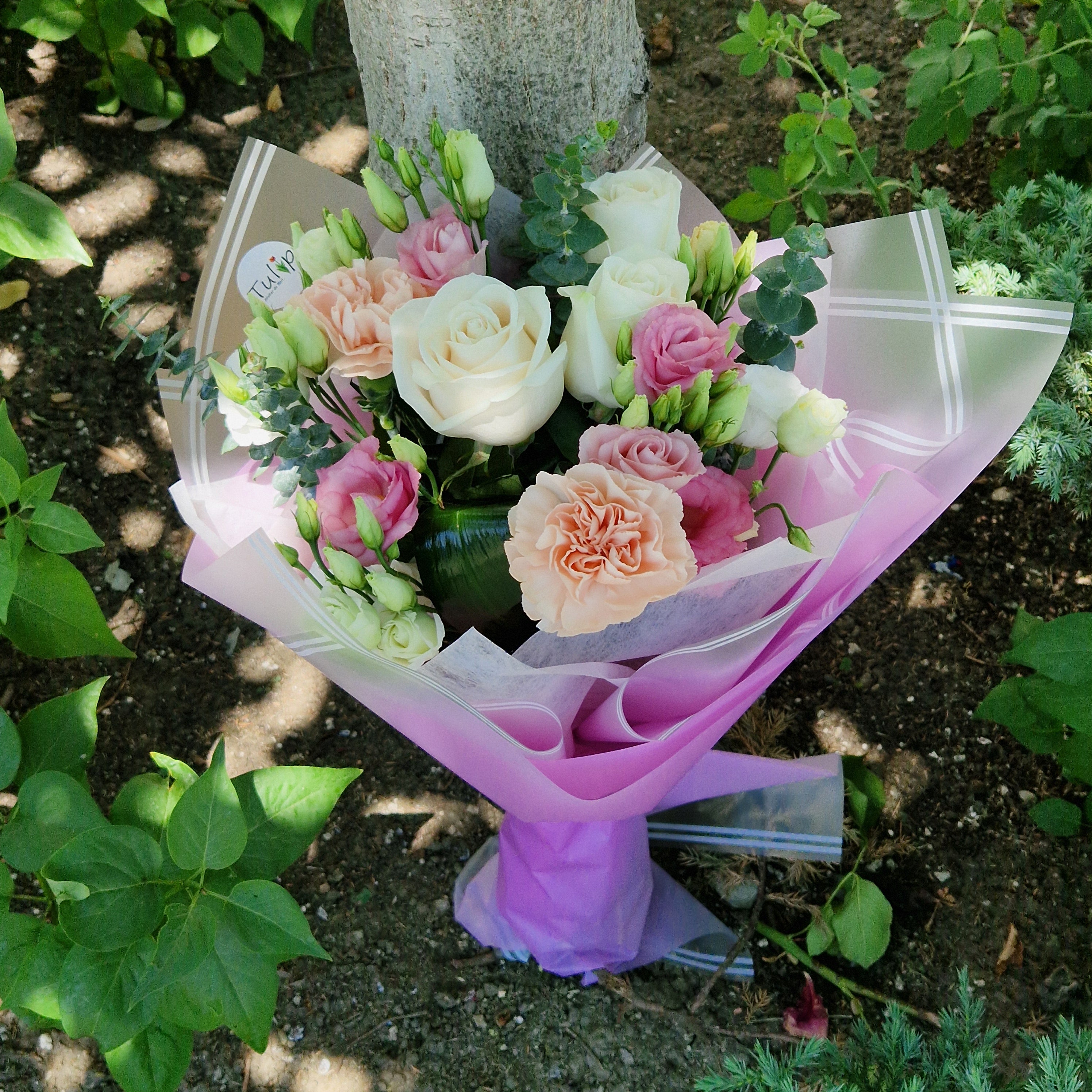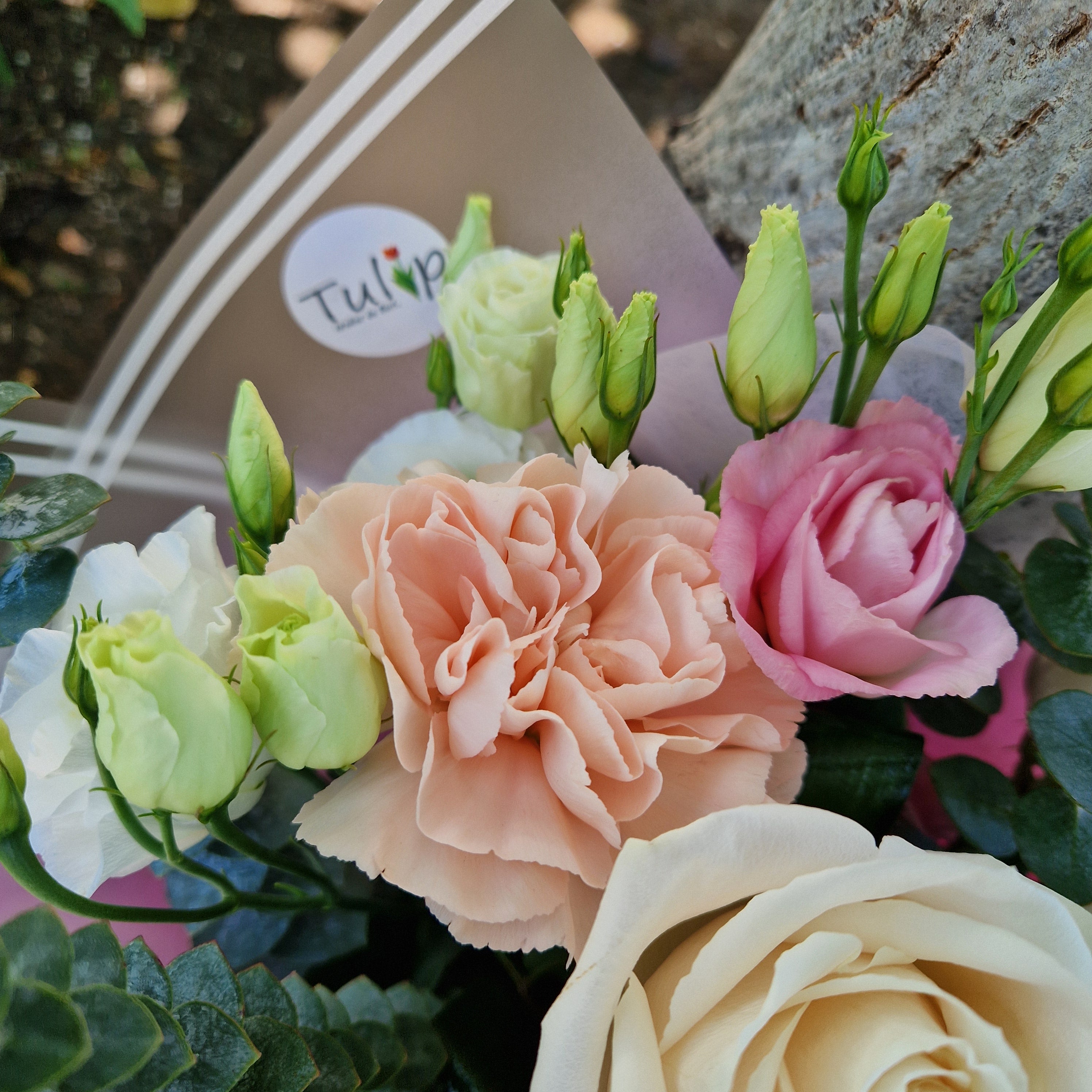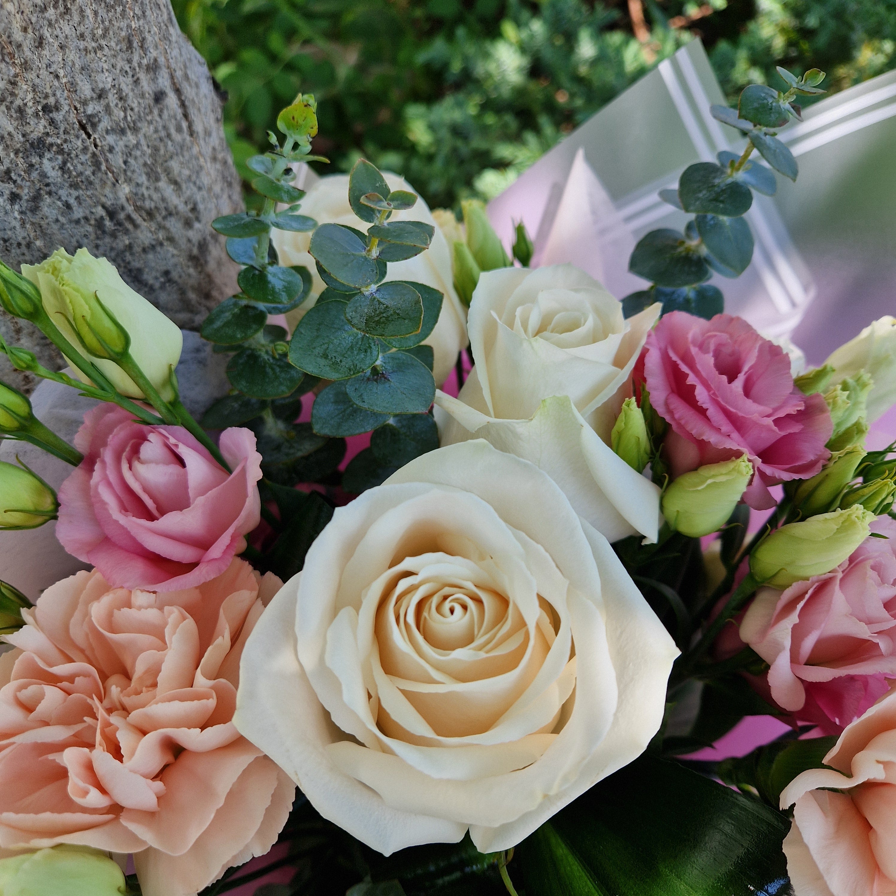 Buchet realizat din 3 trandafiri albi, 2 eustoma alba, 2 eustoma roz, 2 garoafe roz sau peach, aspidistra, eucalipt, aralia si ambalaj asortat.