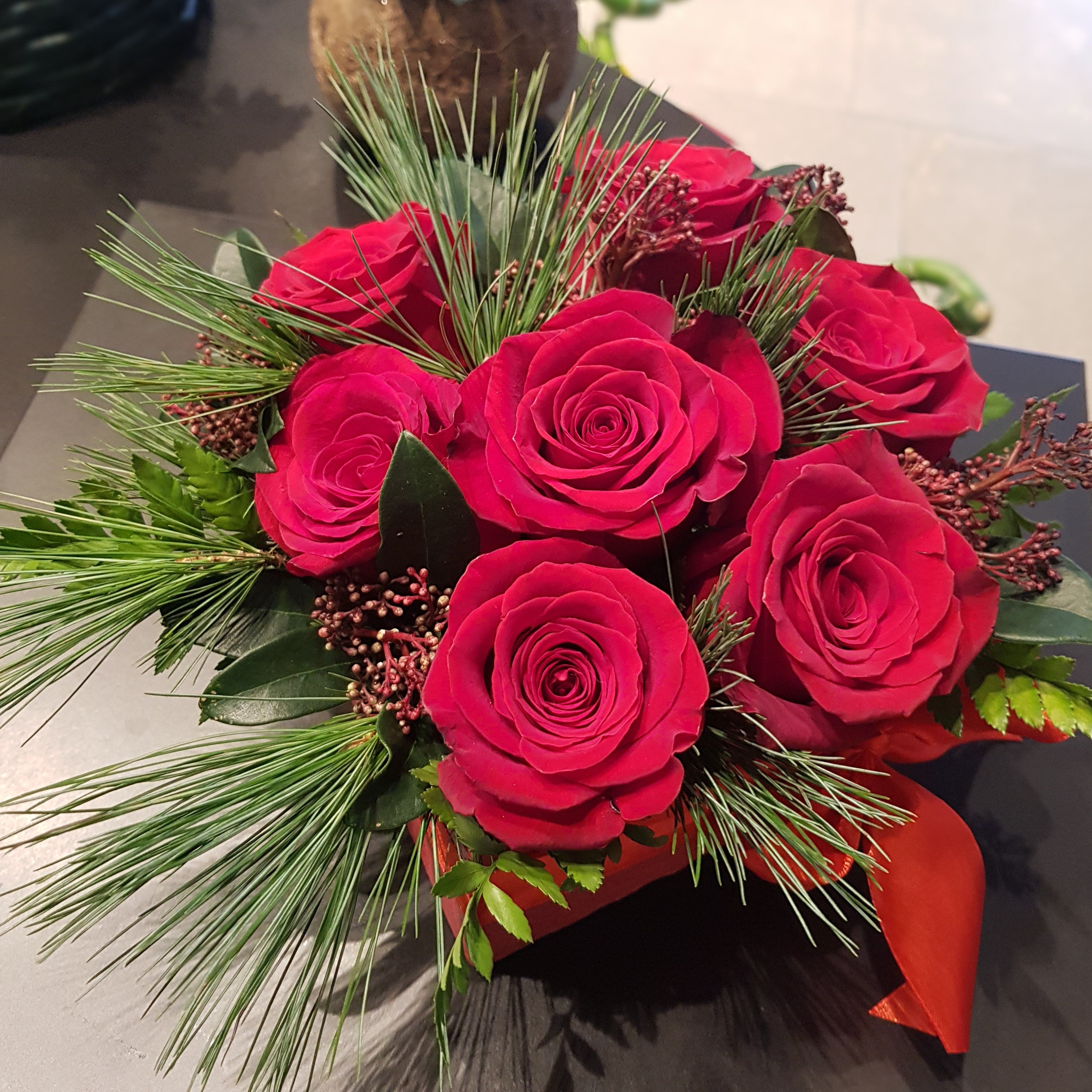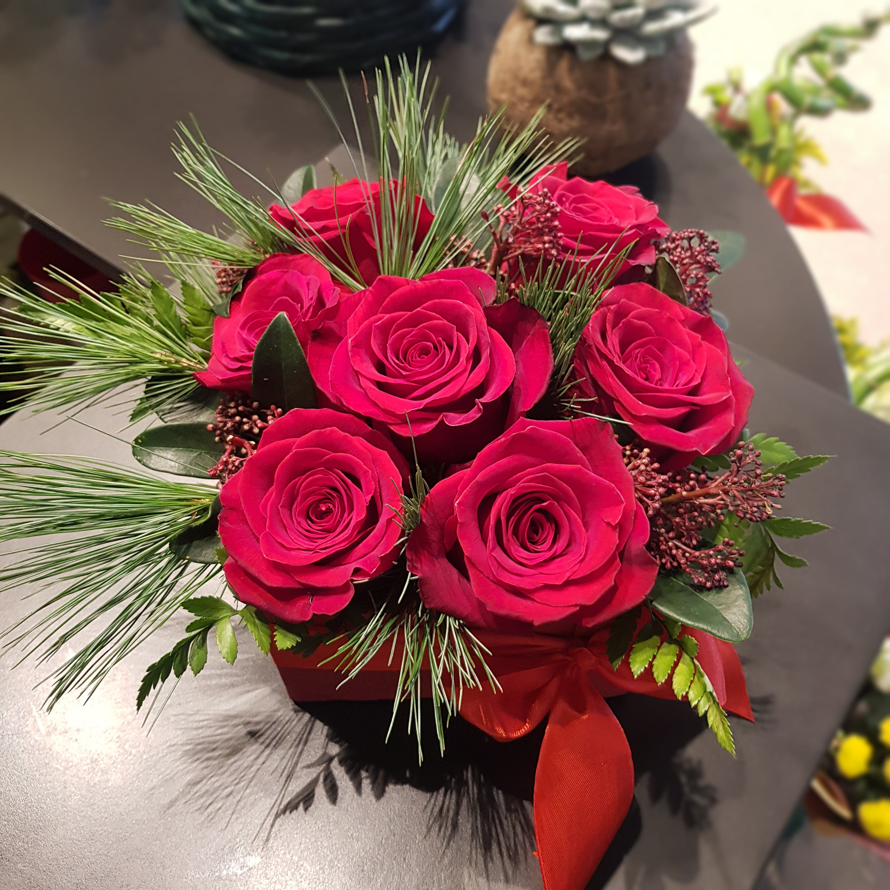 Aranjament floral elegant cu 7 trandafiri roșii, realizat într-o cutie decorativă, completat cu verdeață atent aleasă. În sezonul de iarnă (luna decembrie), compoziția este îmbogățită cu pin natural și skimmia, elemente specifice sărbătorilor de iarnă, care oferă un aspect festiv și rafinat.